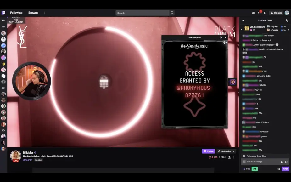 During the search for the vault, the four Twitch streamers relied on their communities to solve challenges, decipher clues, and locate the secret location of Black Opium. As they moved from one challenge to another, the streamers were immersed in a Minecraft world inspired by YSL Black Opium.